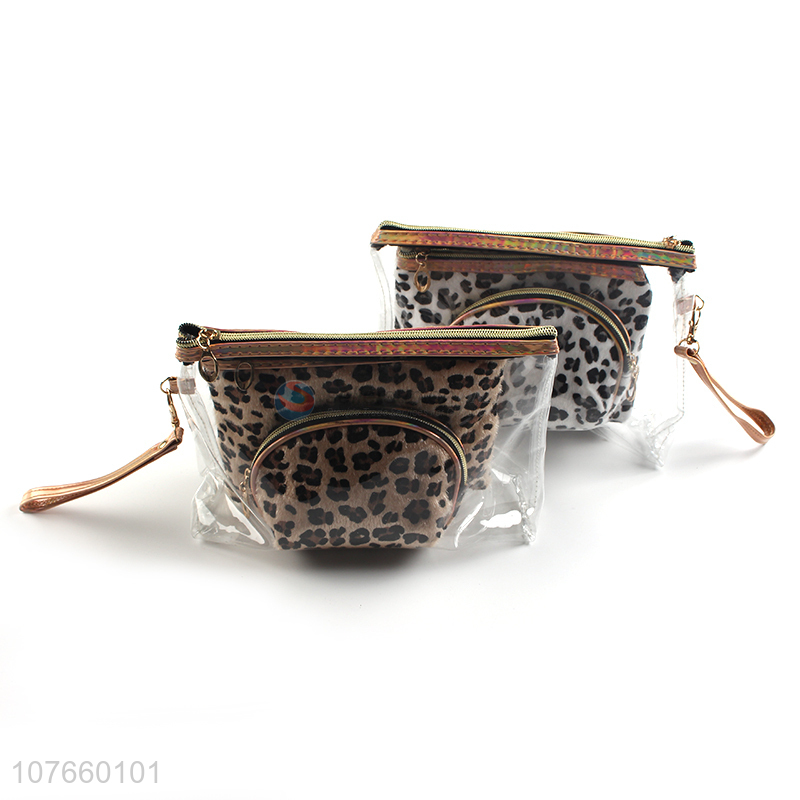 Brown and white leopard print plush style fashion cosmetic bag three-piece set