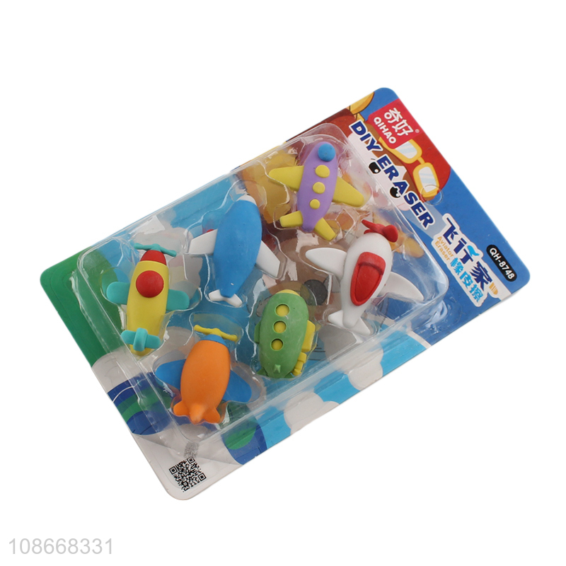 Factory price 6pcs cartoon kids plane shape eraser set for school