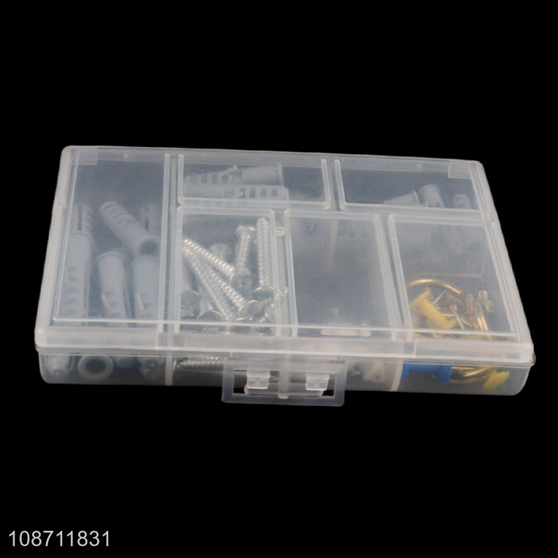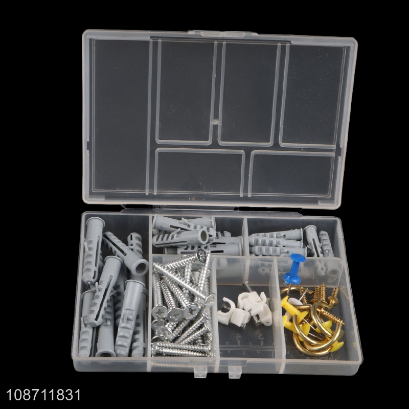 Wholesale 80pcs home hardware set. including: 4mm,5mm,self-tapping pennant rise 10 sets each 6mm self-tapping pennant rise 8 sets;5mm wire clips10 pcs,1 inch cup hooks 4 pcs,push nails 10 pcs