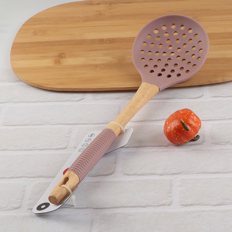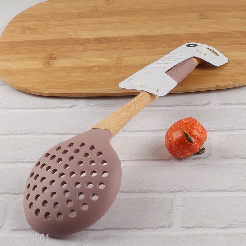 Hot selling silicone skimmer strainer slotted spoon with wooden handle