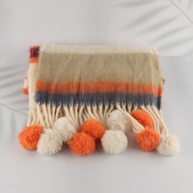 Good Quality Winter Scarf Striped Cashmere Feel Scarf with Pom Poms